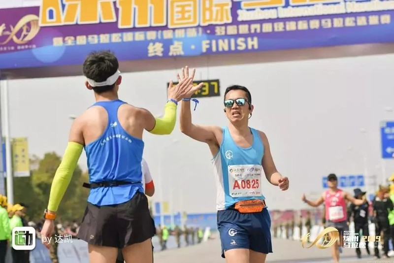 徐州马拉松终点处,两位选手击掌加油。达凯/摄
