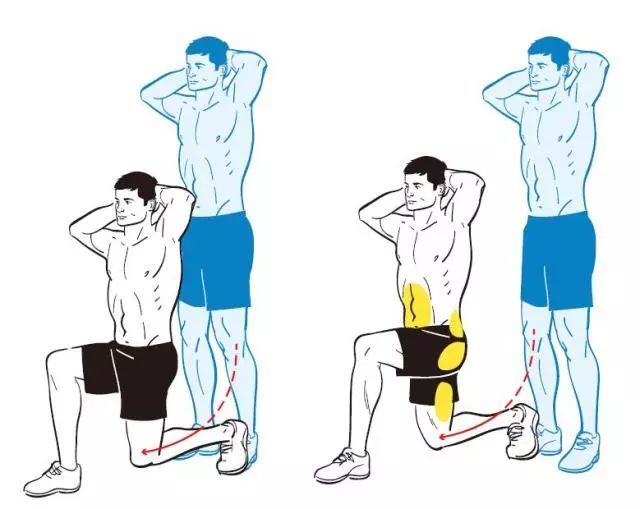 如何做 双手放在体侧。右腿向前迈一大步,同时左腿膝盖落地。胸口打开,背部挺直,屈双膝,髋关节向下。右腿发力上蹬,将左腿向前带。另一条腿前迈,交替换边进行。