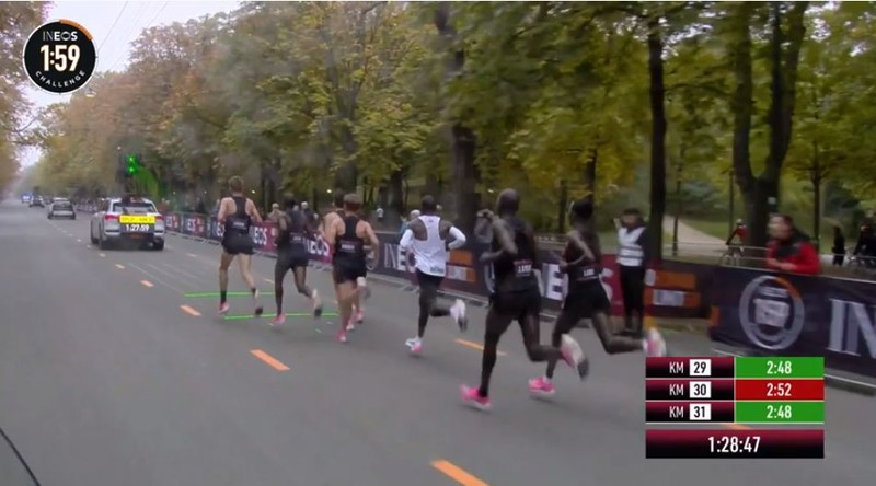 28km处,此时官方给出了最近4km的配速,均跑出了2分50秒/km的速度,并按照当前配速预测完赛成绩为1小时59分49秒!