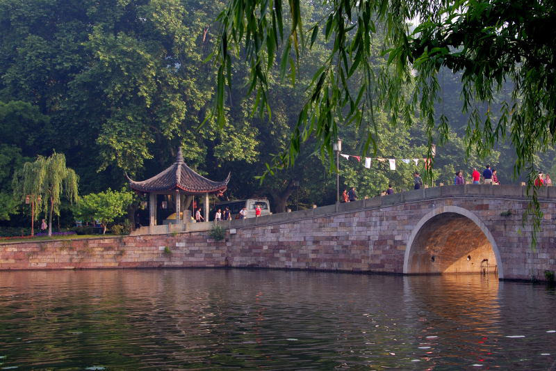 跑着跑着,看到一个人流量很大的口子,啥都别管就往里挤吧,没错,这就是苏堤南口,难口,很难,尤其是白天,跑过一座桥左手花港观鱼,右手游船上船处,各地旅游大军各种方言大喇叭此起彼伏,赶紧跑吧。苏堤六吊桥,从南至北过第二吊桥后,游人五五六六的散游着,此时微风拂面,美景当前,个人show正式开始!此时你一定要昂首挺胸,小腹收紧,前脚掌着地,步伐飘逸,即使裤衩背心多威鞋,也要把深邃坚毅的眼神演绎到位,一路必定会收获游人赞美,切不可回应破功,要把表情速度一直憋到苏堤北口最后的跨虹桥。一跨而上,站在桥头,喝一声:爽!~桥左面就是曲院风荷,这些天满池风荷摇曳,姑娘小伙们速速来赏。晚上这里就封了湖上演印象西湖,偶尔还有小船从桥下而过,载着还未卸妆的裙带飘飘的才子佳人,恍然有点穿越:别急,前面就有佳人!公子您跑慢点。奴家赶不上哎。