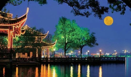 不敢兴趣就不看了继续跑吧,跑出小径就是大道,迎面一圆拱门,里面就是平湖秋月,有茶室古琴音乐,秋天在亲水平台上赏月,甚妙。最忆平湖秋月夜,一曲古音绕梦回。一朋友的父亲在qq 上聊起杭州就这般吟诵起来。