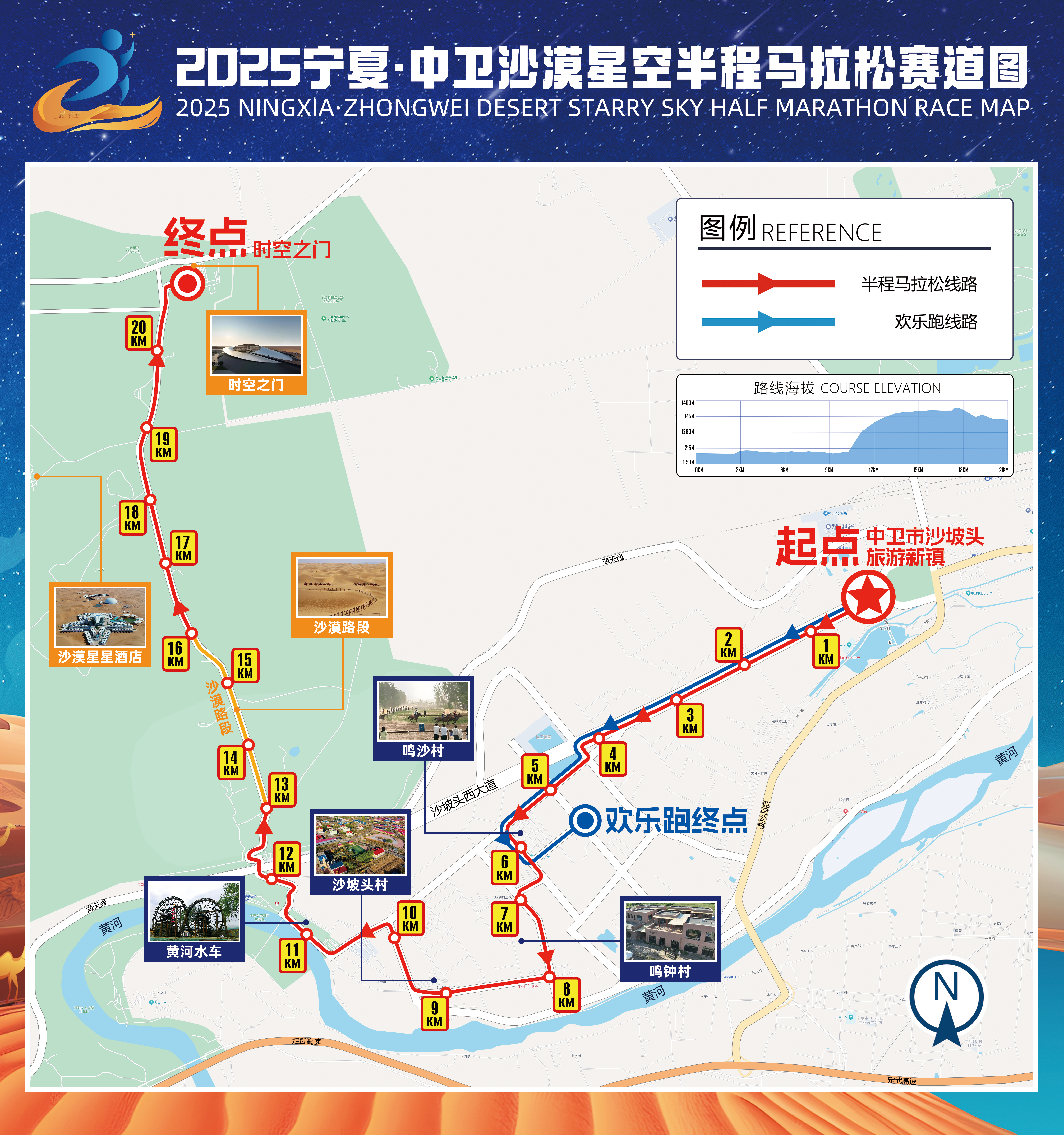 半程马拉松:沙坡头新镇(起点)-中央西大道-沙坡鸣钟田园综合体(左转)-迎沙路-鸣沙村-鸣钟村-沙坡头村-滨河大道北线-迎沙路-沙坡头景区水车门-景区内部路-时空之门(终点)