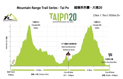 → 大埔公路大窝段→ 林锦公路 → 社山 → 卫奕信径第八段 → 大埔头水围村 (CP1)→ 卫奕信径第八段 → 九龙坑山 → 颂雅路 → 汀丽路 → 新围仔路 → 大埔头水围村 (终点)